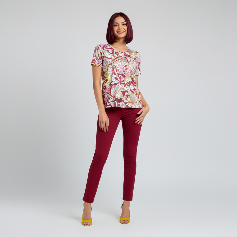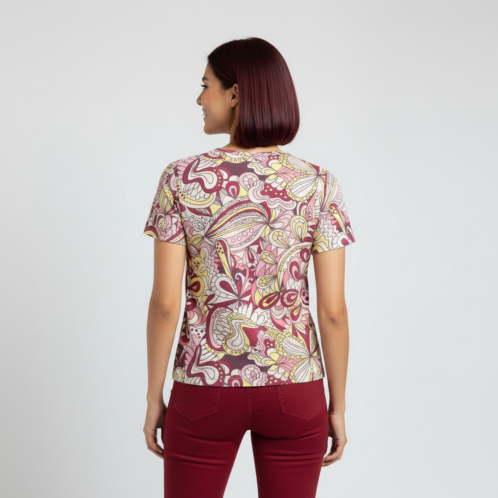 Bold and bright and ready to take you anywhere. This stunning Piki Crew Neck Fitted Tee is a must-have for any fashionista's wardrobe. With a flattering palette of colors & wild abstract floral print, this top makes the perfect base for your next outing!