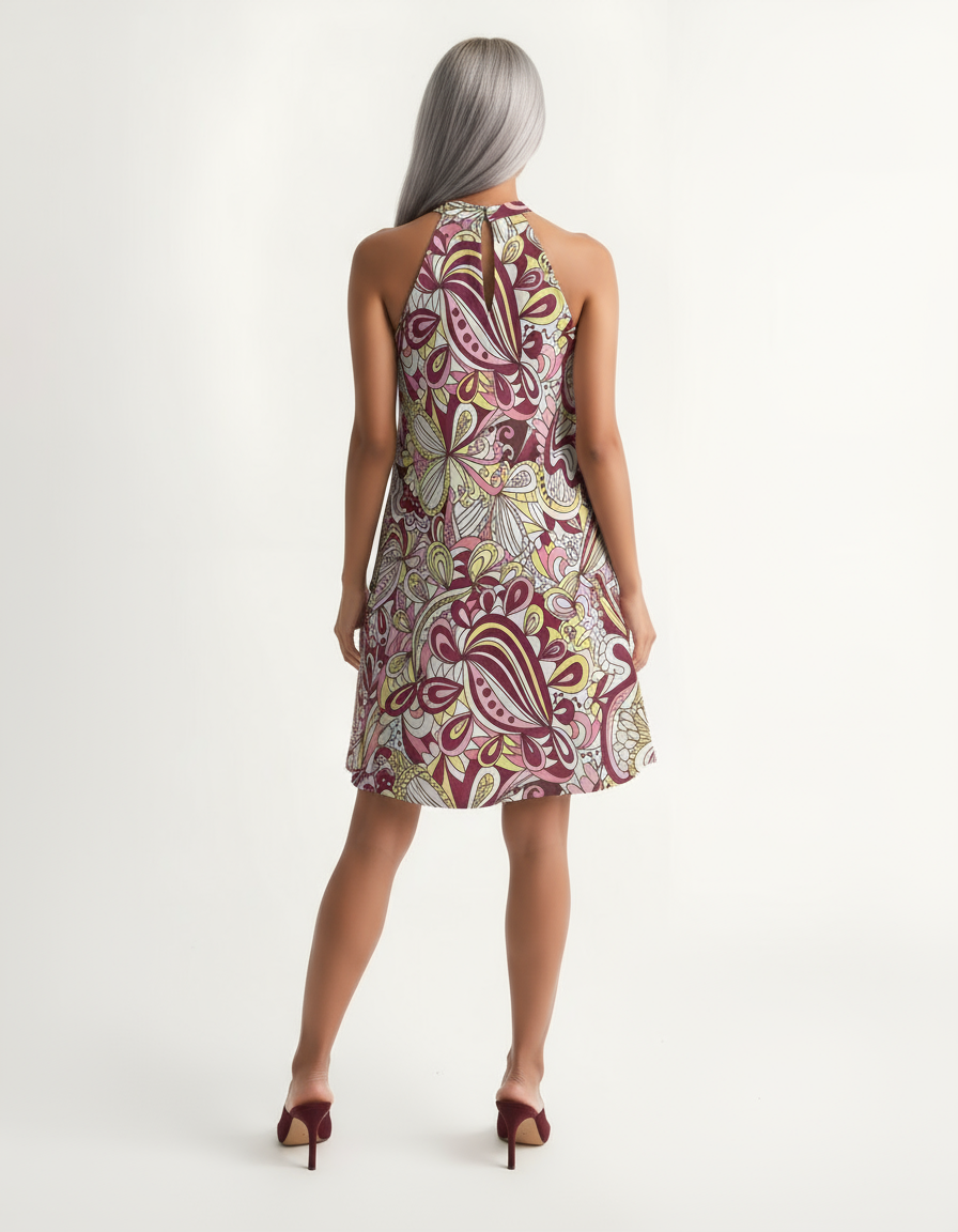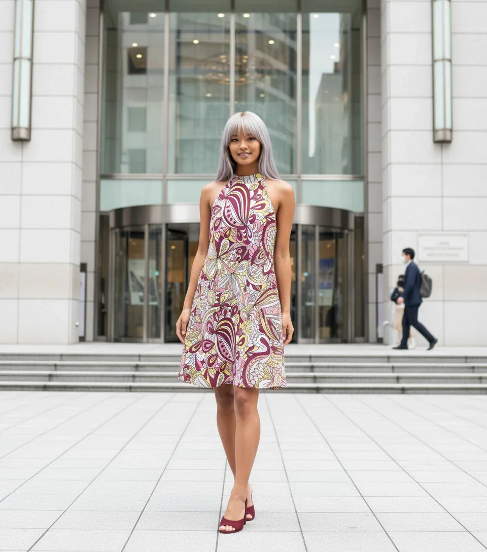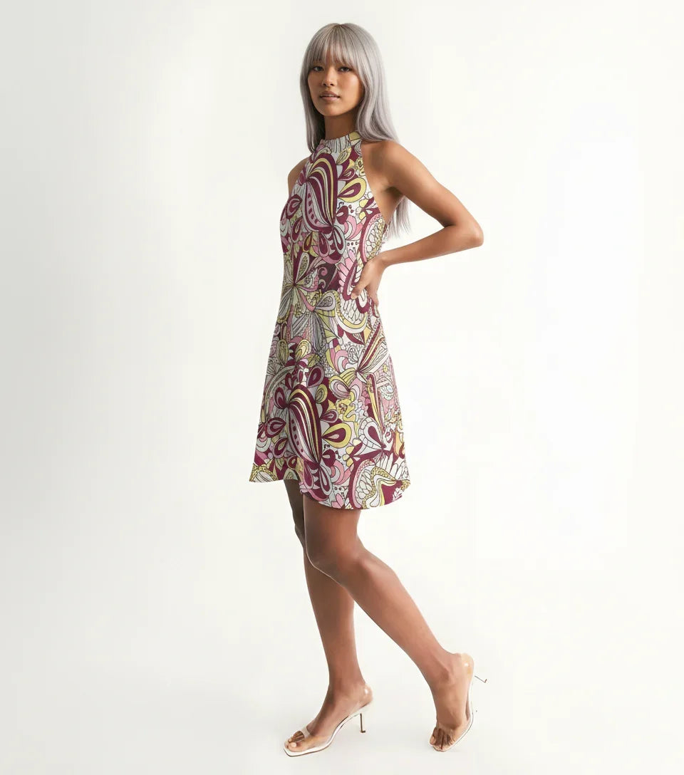 This stunning halter-neck dress features a mesmerizing psychedelic floral print in bold shades of pink, purple, and yellow, swirling with intricate paisley-inspired motifs that evoke the free-spirited vibes of retro summers. Crafted from lightweight, lined breathable fabric, it offers a flattering halter silhouette that accentuates your shoulders and neckline, while the playful flare skirt adds a twirl-worthy swing for all-day comfort and movement.