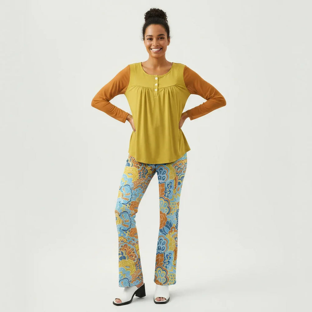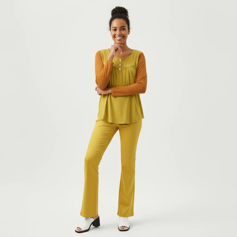 Embrace the playful yellow and orange hues of our color-blocked Pinsa top. This babydoll style is effortlessly comfortable and always ready to be worn. Pair it with your favorite denim or amp up the fun with our Pinsa bottoms for an unbeatable look.