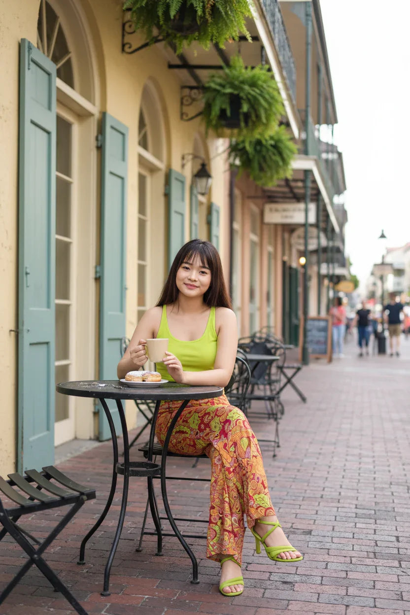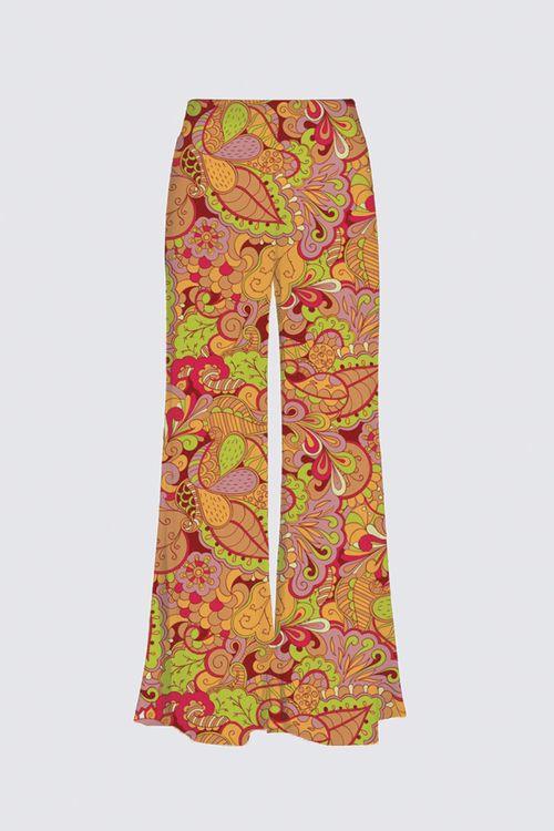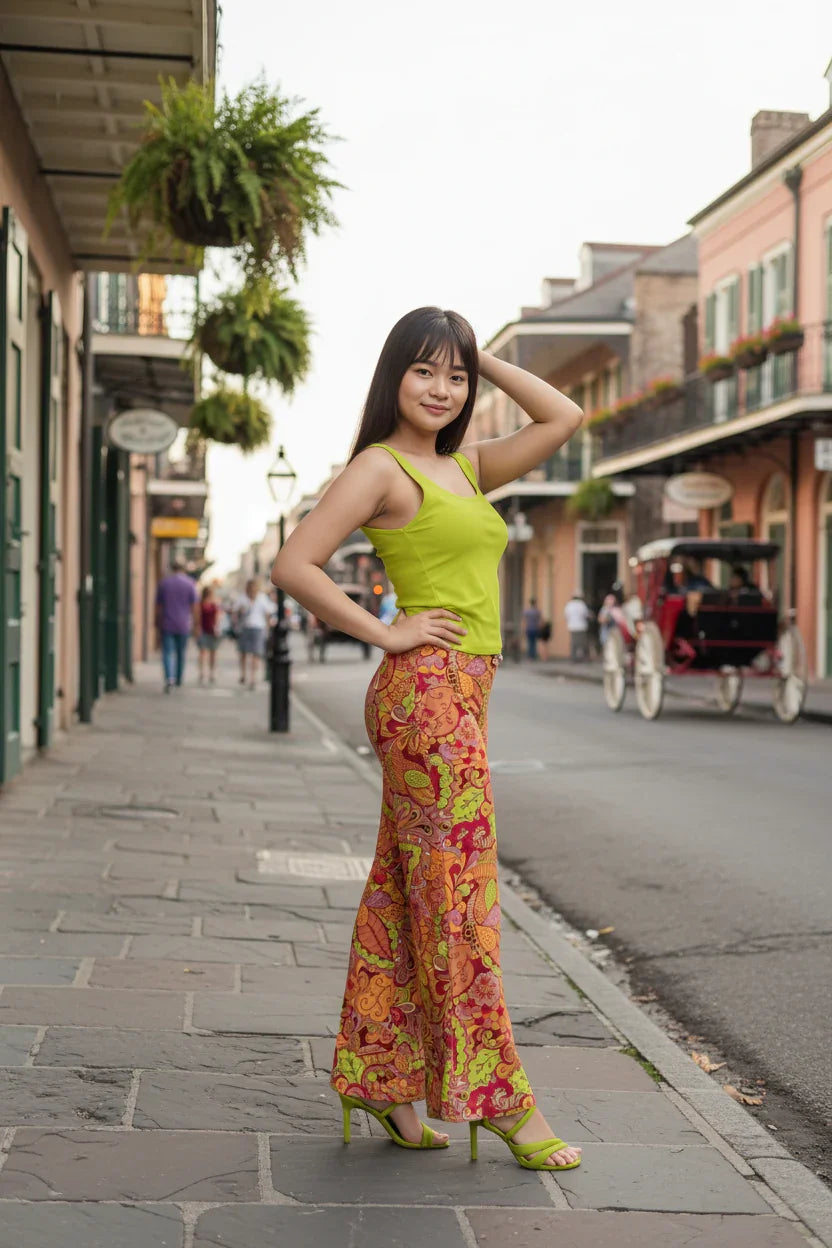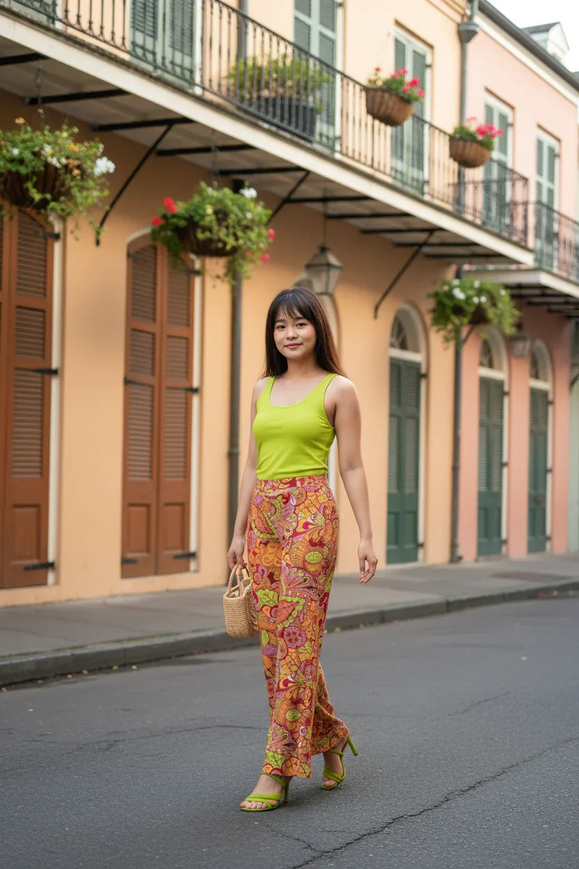 Versatile Styling: Pair these pants with a simple tank top, like the one shown, for a casual yet chic look, or dress them up with a fitted blouse and statement jewelry for a more sophisticated ensemble. The vibrant print allows for endless styling possibilities, making it a versatile addition to your wardrobe.