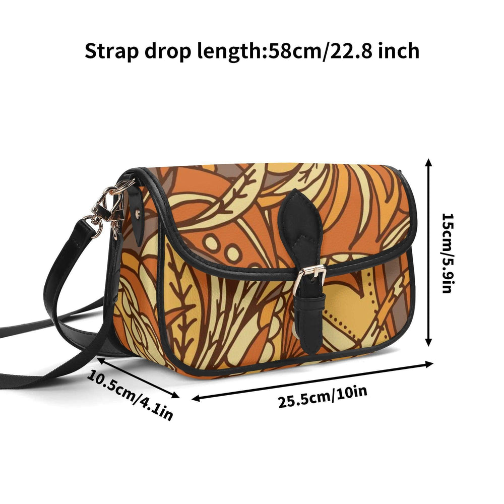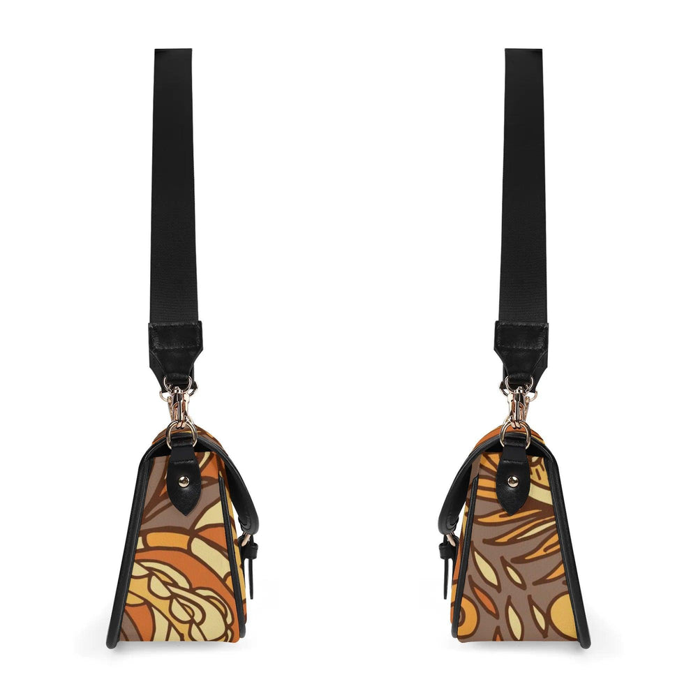 Indulge in the perfect blend of style and practicality with this striking crossbody bag, designed to elevate your accessory collection. The bag features a compelling abstract leaf pattern in a warm palette of oranges and browns, offering an artistic touch to any outfit.