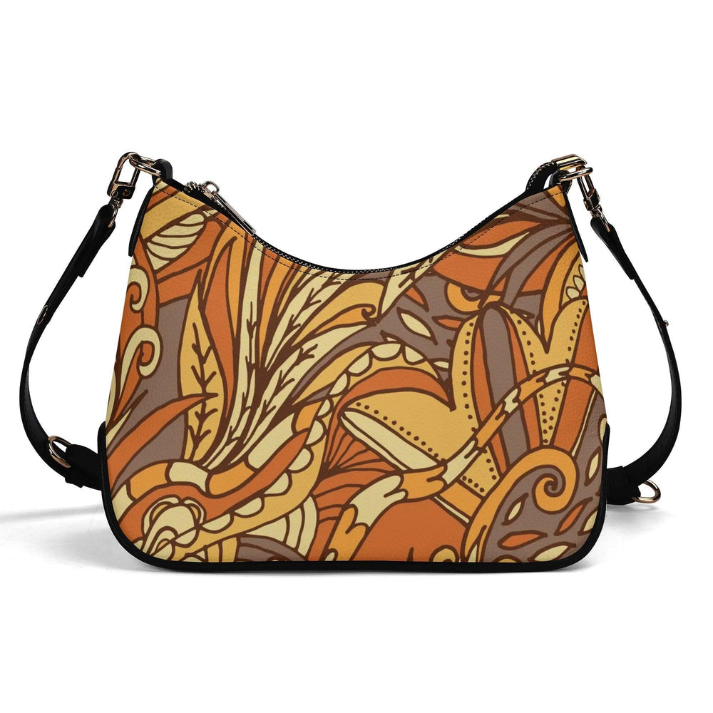 Indulge in the alluring charm of this vibrant Prin flap shoulder bag enhanced with a fusion of natural shapes, botanical swirls, and intricate filigree. This design evokes a sense of motion and warmth, with a bold and refined pattern in a rich fall color scheme of Hot Cinnamon Orange, Neon Carrot, and Casablanca Yellow. The addition of Rich Cioccolato and Leather Brown add depth and grounding, while Chalky Orange-Yellow tones bring a dreamy, sunlit contrast. This mesmerizing bag takes inspiration from bohemian art and vintage paisley prints, telling a story of adventure, passion, and an untamed spirit through its swirling leaves, elaborate florals, and abstract geometrics.