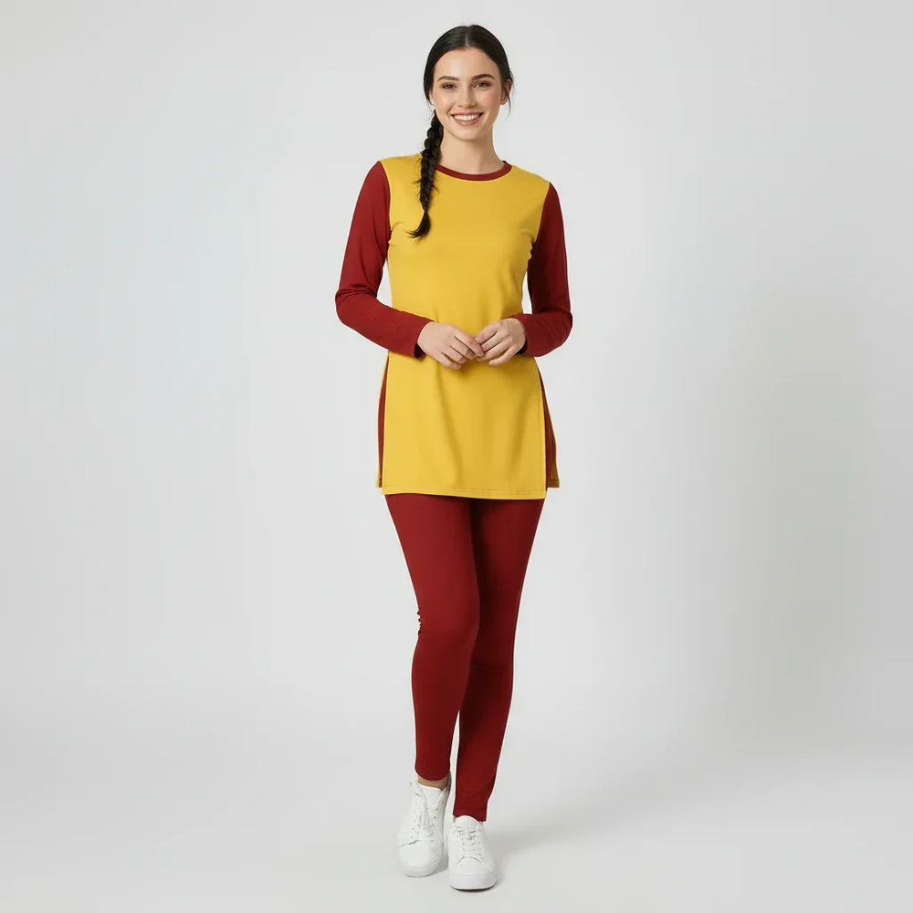 Elevate your wardrobe with the Safrana Color Series Dress 2-Piece Set in Brick Red and Sunglow Yellow – a vibrant, modern fusion outfit designed for effortless style and all-day comfort. This eye-catching two-piece ensemble features a long-sleeved tunic top with a color-blocked design: a sunny sunglow yellow bodice that flows into a knee-length silhouette with side slits for easy movement, paired with rich brick red sleeves and matching slim-fit leggings. Crafted from soft, breathable fabric, this set offers a flattering, figure-skimming fit that's perfect for casual outings, work-from-home days, or light layering in transitional weather.