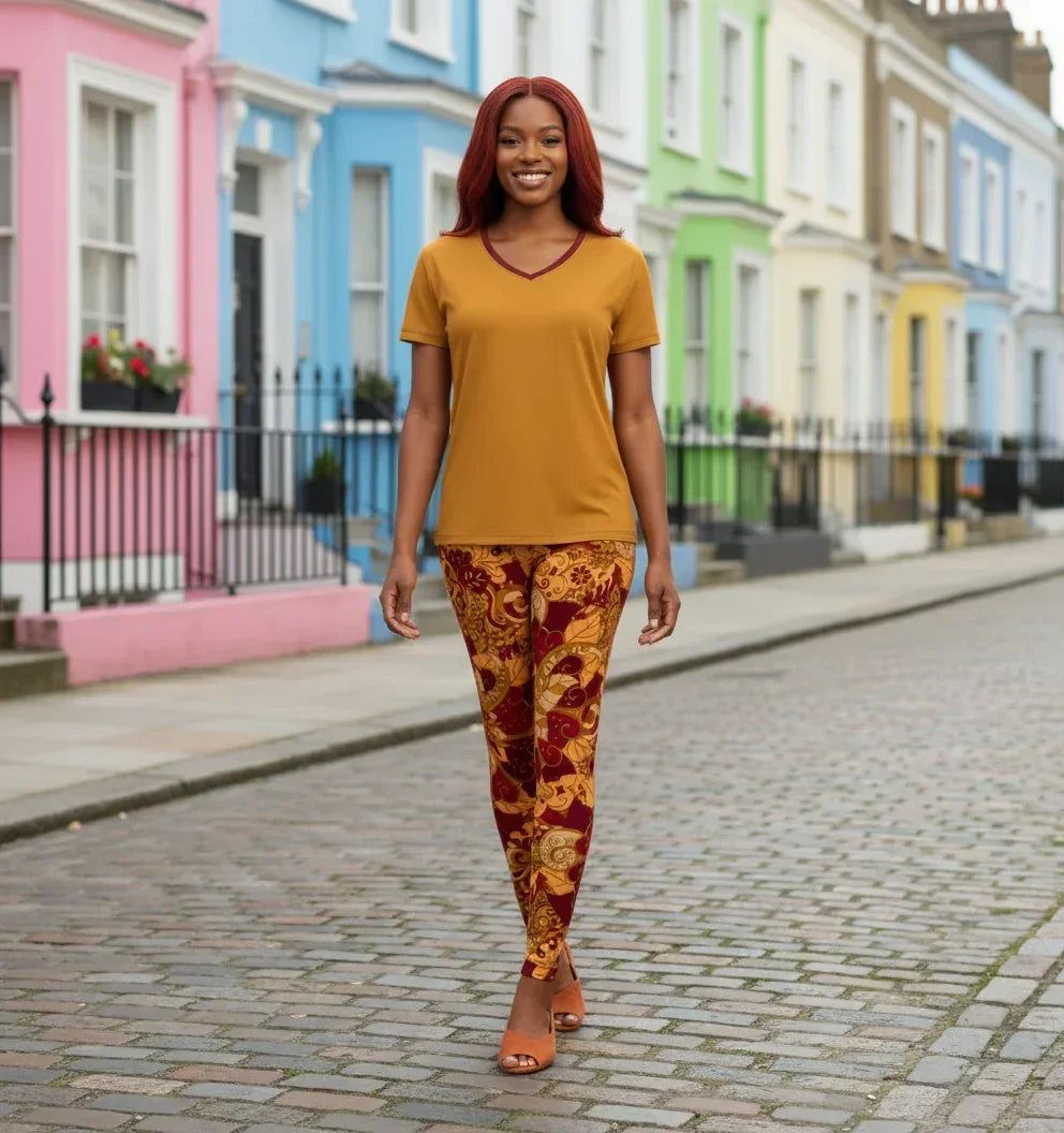 Posh and luxurious, you won't get enough of these statement-making leggings! Crafted from smooth and buttery soft Lycra Spandex, these leggings are adorned by our Renai print, sporting a stunning abstract paisley floral print in robust shades of orange and red.