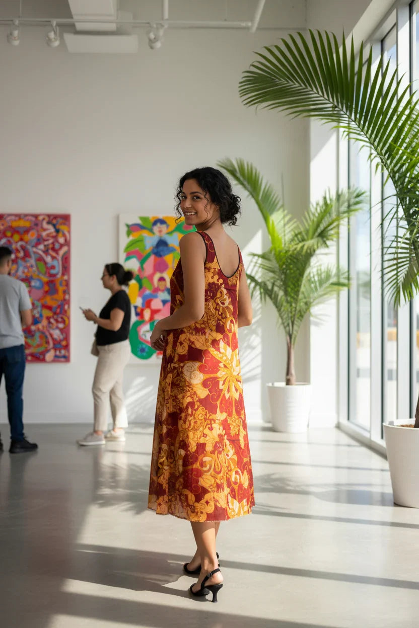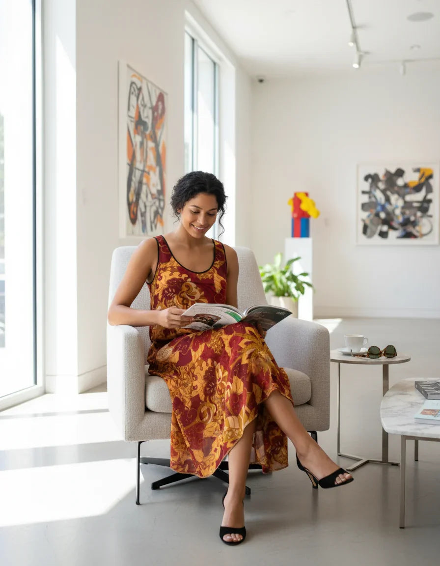 Our Renai Midi Dress is a stunning, handmade dress that can be dressed up or down with ease. This stunning piece features our allover Renai abstract paisley floral print and flowing silhouette. The crew neck, tank shoulder straps & low cut back, make this the perfect night out dress.
