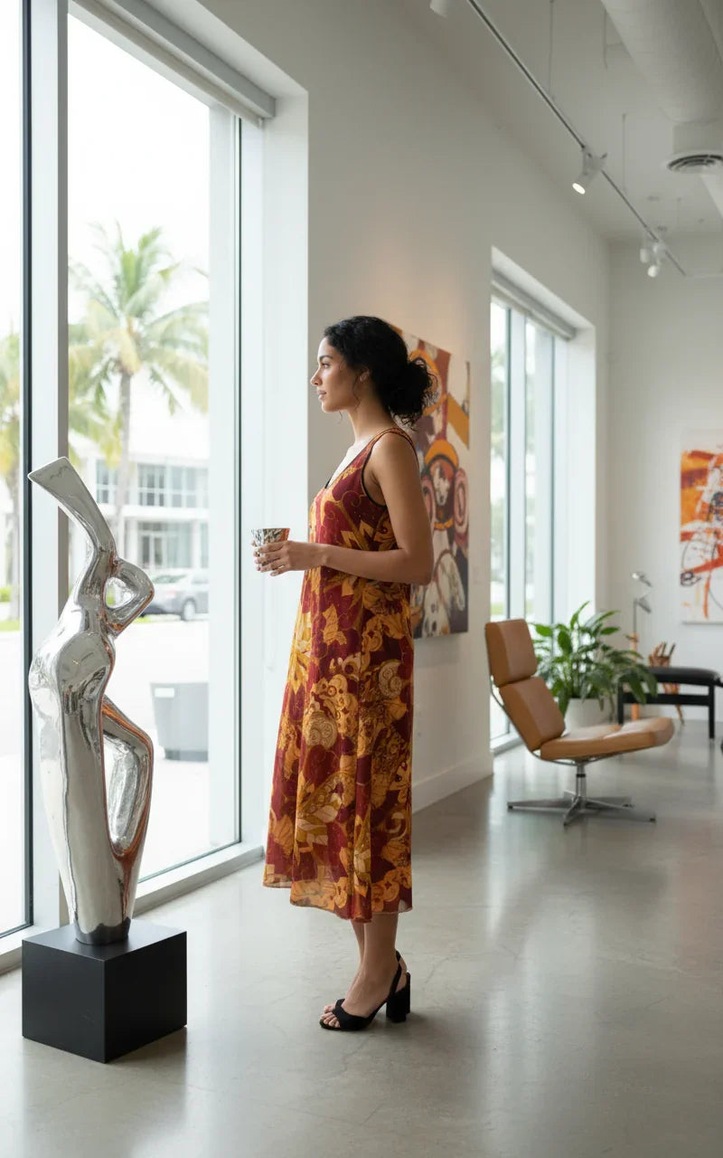 Experience the enchanting Renai Print, where intricate arabesques envelop you in a lavish realm of imaginative elegance, as if penned in fluid calligraphy. Whimsical botanical details add a delightful touch, while a vibrant floral starburst design captures attention with its fiery autumnal shades.