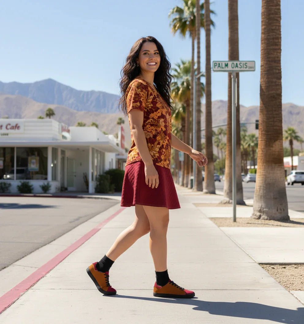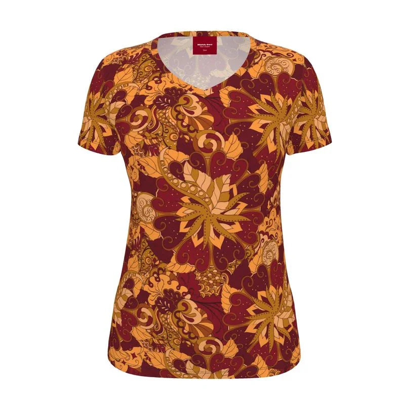 Elevate your everyday wardrobe with the captivating Renai Pattern Tee, a must-have for the modern woman who craves effortless style and vibrant flair. This short-sleeve V-neck t-shirt features an exquisite, intricate floral paisley print in rich autumnal hues of deep crimson, warm amber, and earthy brown, inspired by timeless bohemian motifs that evoke a sense of wanderlust and sophistication.