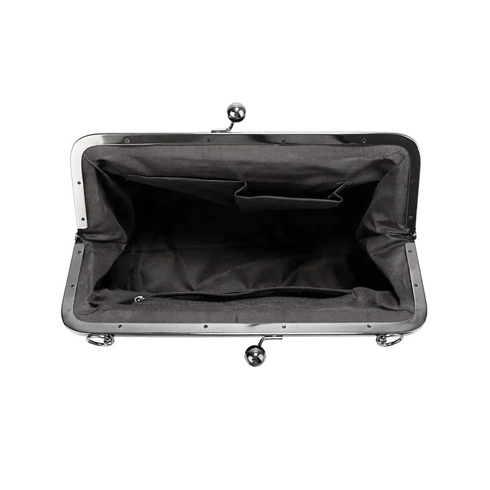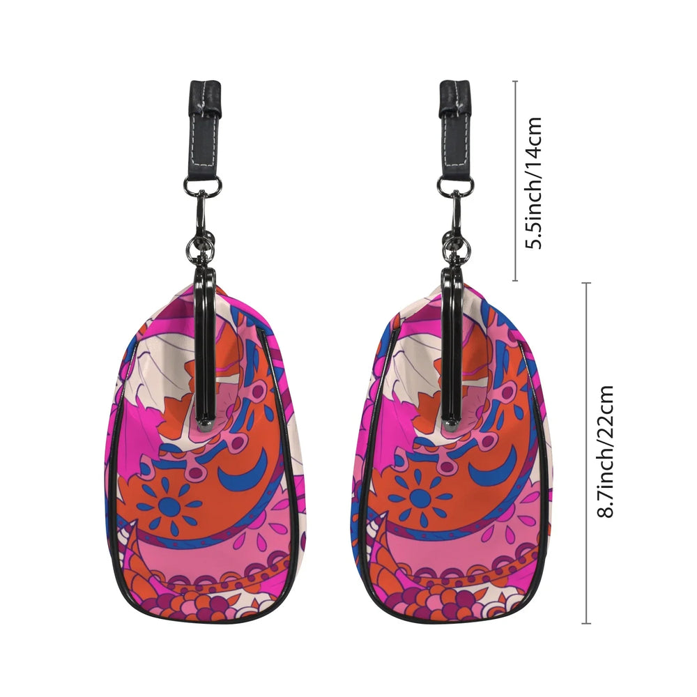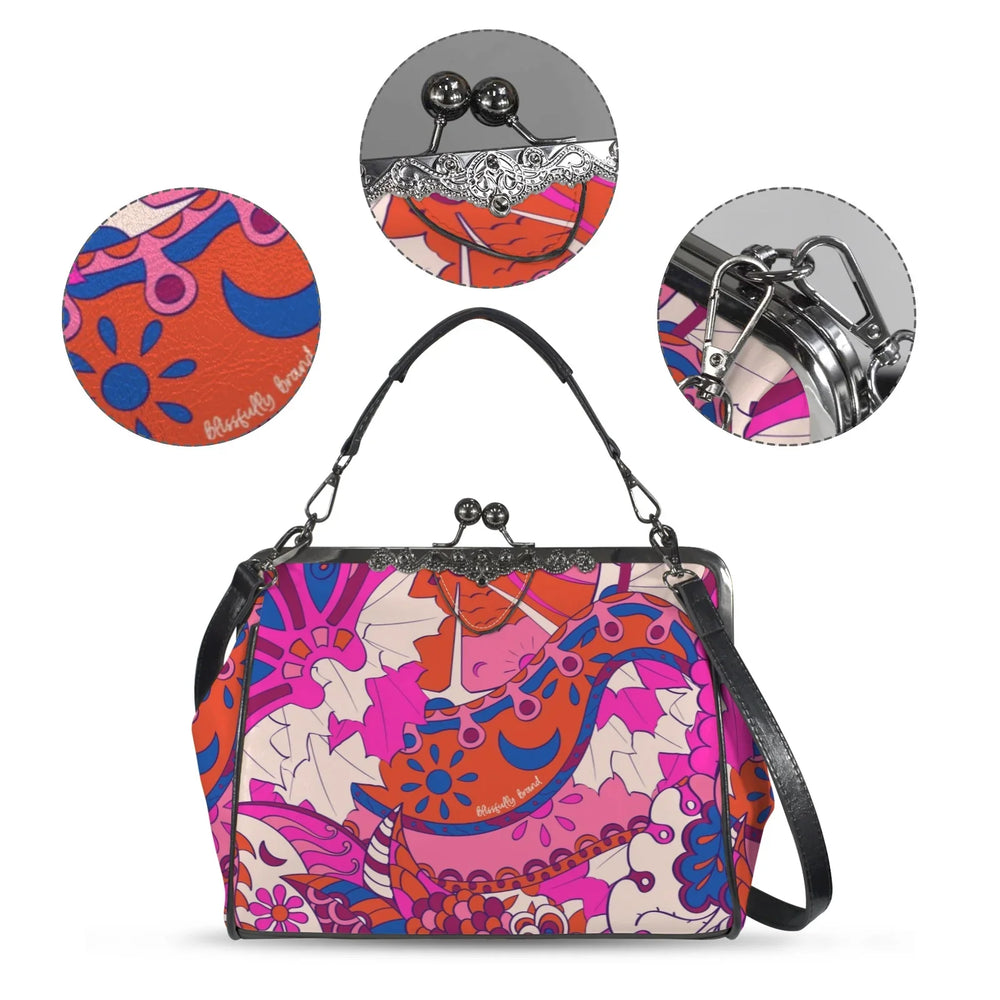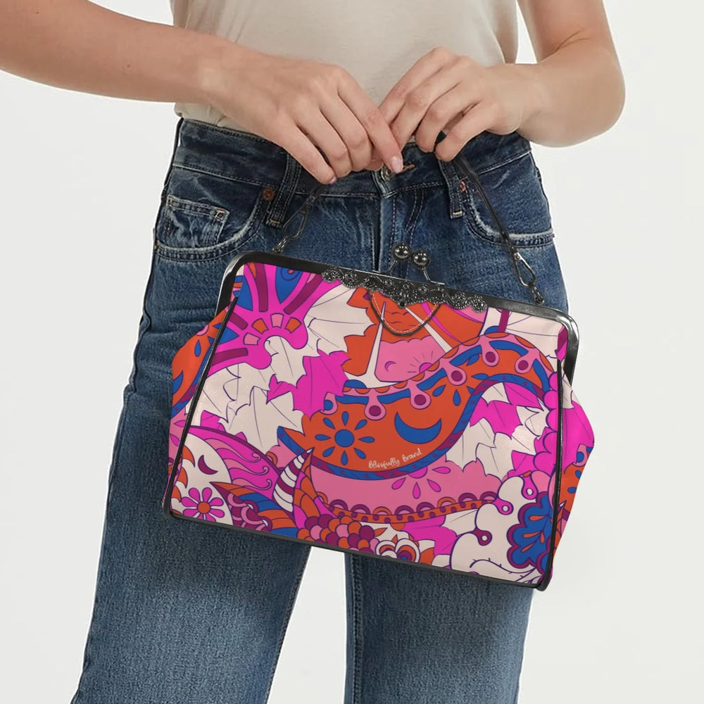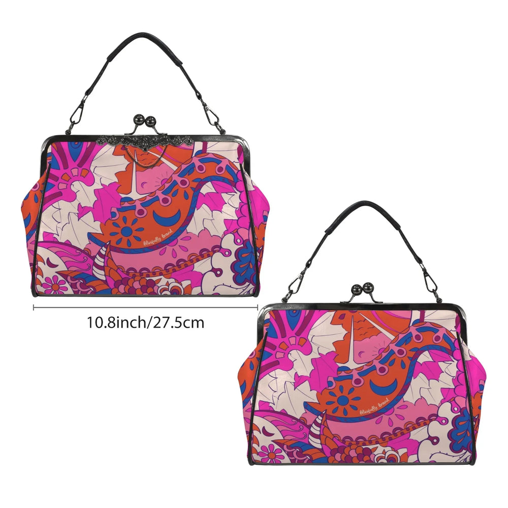 Ignite your style with the mesmerizing Sameria Print Kiss-Lock Handbag – a burst of 1960s psychedelic magic in every vibrant swirl! Imagine carrying a piece of retro bliss: bold paisley patterns dance in electric pinks, fiery oranges, deep blues, and creamy whites, creating a hypnotic design that's impossible to ignore. Crafted from premium, durable faux leather with a glossy finish, this kiss-lock frame bag features a secure metal closure with ornate detailing, ensuring your essentials stay safe while adding a touch of vintage glamour.