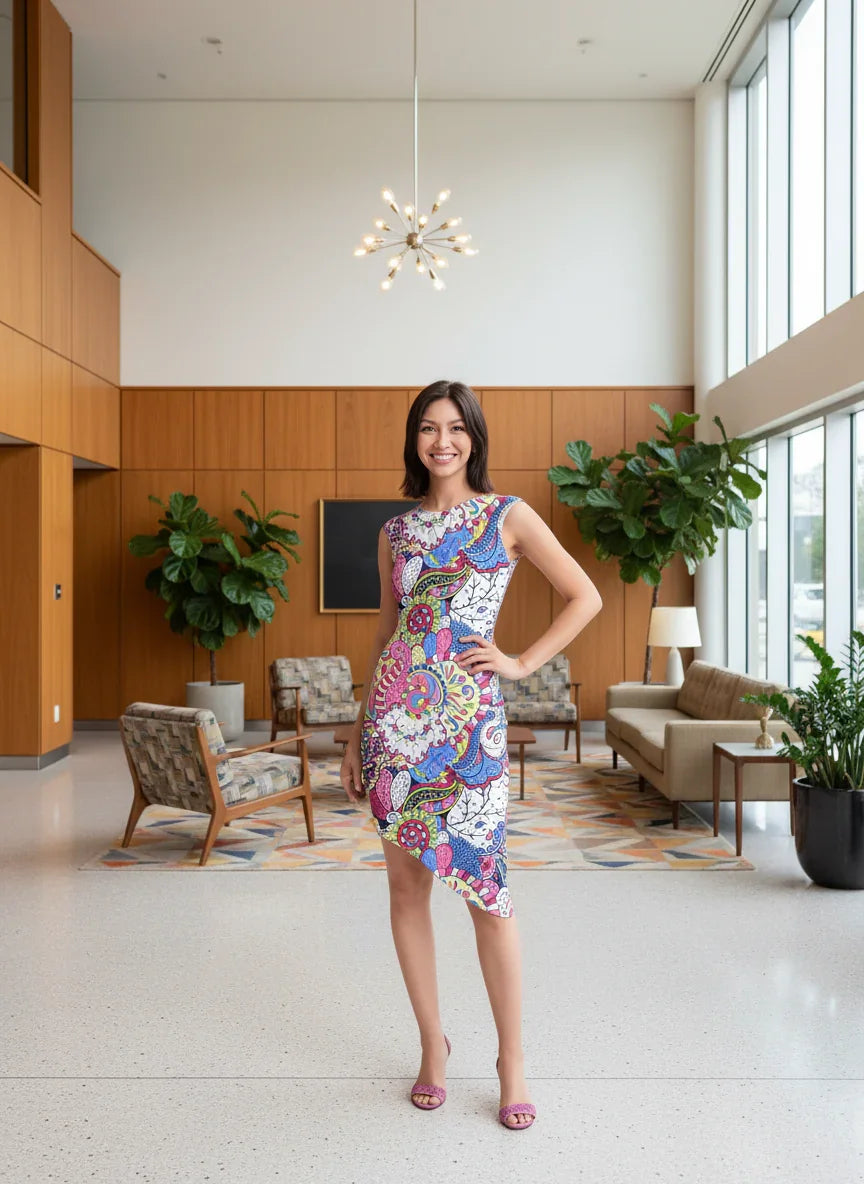 Step into the spotlight with this mesmerizing, vibrantly patterned dress that's guaranteed to turn heads and elevate your wardrobe. Crafted with a sleek, form-fitting silhouette, this dress perfectly contours to your figure, offering both comfort and style without compromising on either. Its sleeveless design and elegant knee length make it a versatile choice for various occasions, from sophisticated soirees to upbeat gatherings. Perfect for making a statement, this dress doesn't just speak to fashion, it sings.