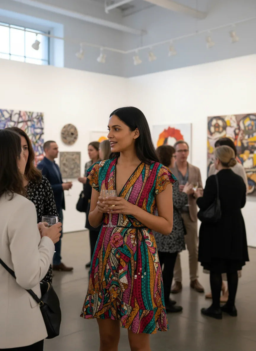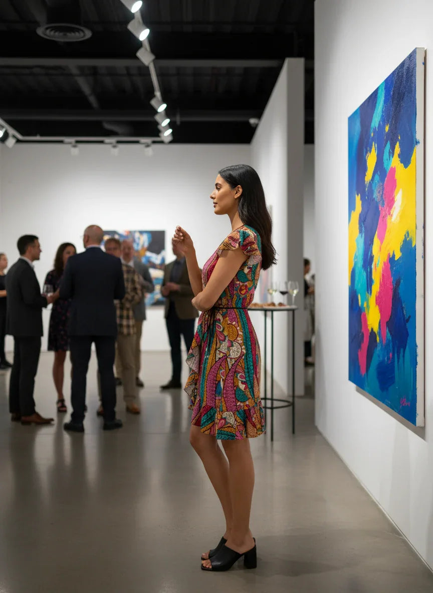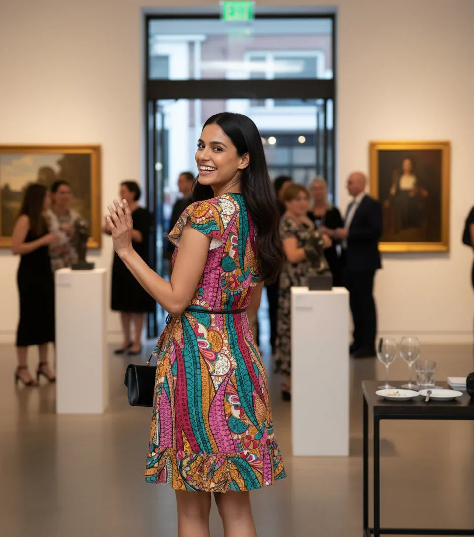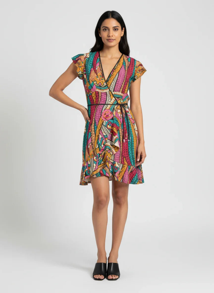 Bring some extra fun to your wardrobe with this super flattering wrap dress. With a choice of 3 luxurious fabrics to choose from in our stunning Taki multi-colored print, the flounce hem and sleeves, wrap closure and flattering silhouette, this will be your new definition of playful sophistication.