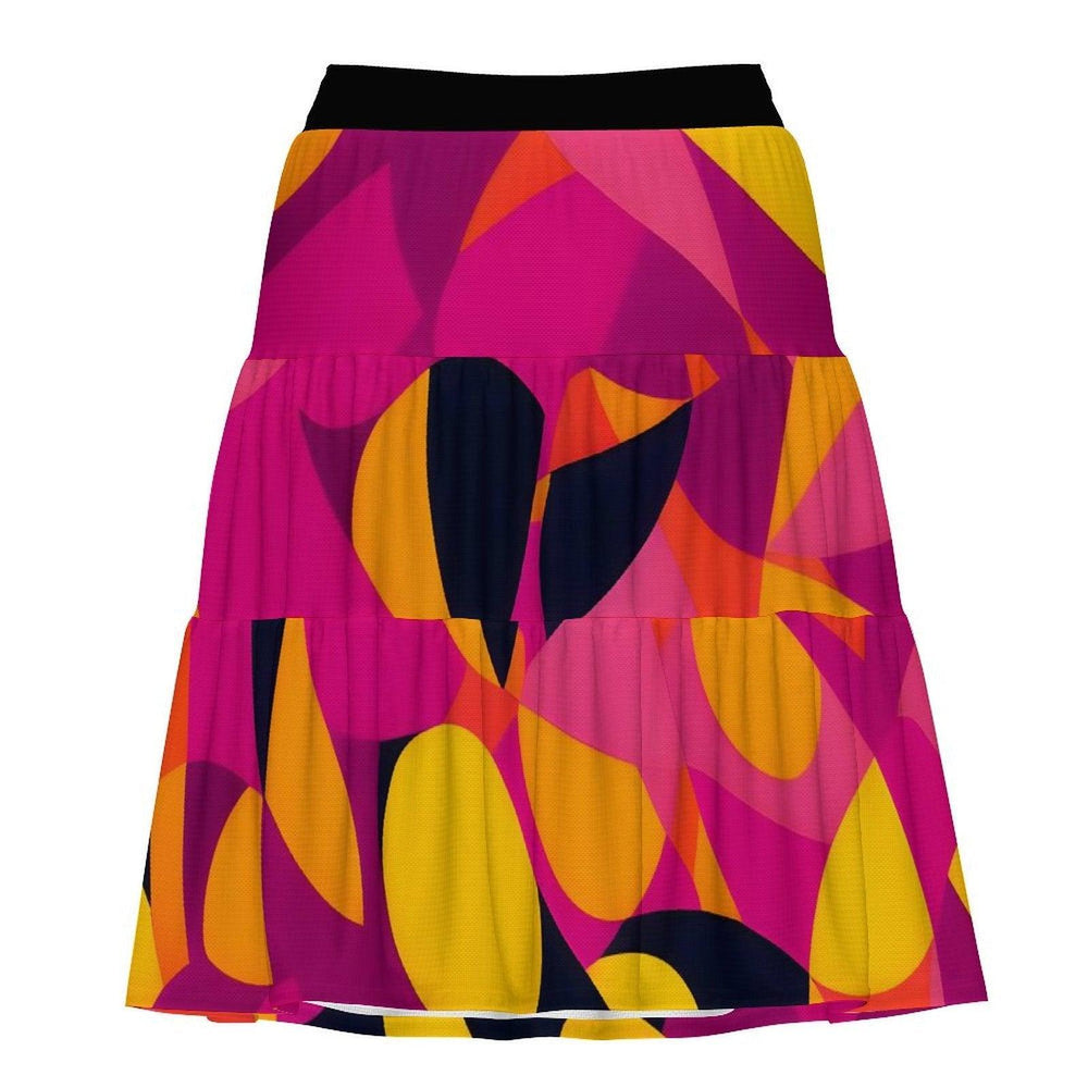 Experience a visual adventure with our Flight 929 Tiered Ruffle Skirt - Airline Series. This unique piece showcases mesmerizing patterns in eye-catching colors and shapes. Our handpicked color palette will inspire your imagination with bold hues like Cerise, Lipstick Pink, and Pomegranate, as well as sunny California Orange, sassy Razzmatazz Pink, energetic Supernova Yellow, and sophisticated Blue Charcoal.