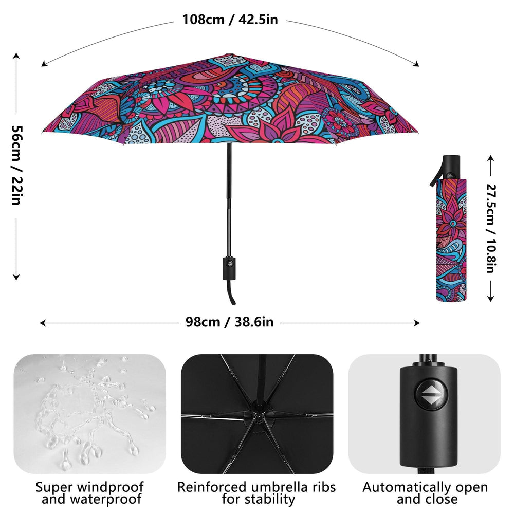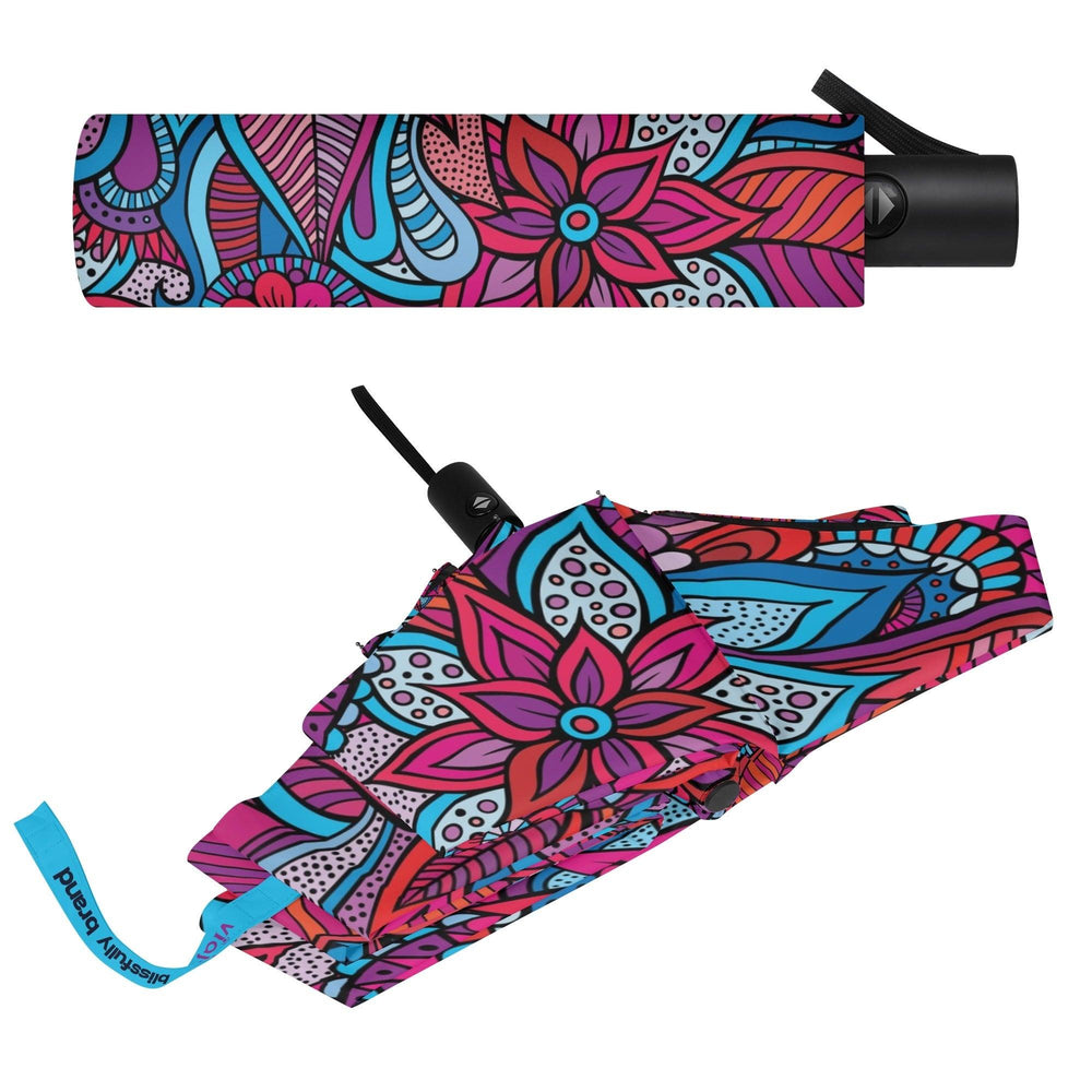 Embrace the elements with flair and functionality with the Viaje Auto Open and Close Umbrella. Designed for the modern traveler, this vibrant and eye-catching umbrella features an alluring floral pattern, blending bold reds, pinks, and blues into an artistically intricate design. Not only does it captivate the eye, but it also offers superior protection against the harshest downpours and blazing sunshine. Compact yet spacious, it's your perfect travel companion for all seasons. Make your rainy days brighter and your adventures unforgettable with Viaje.