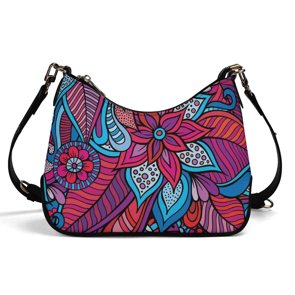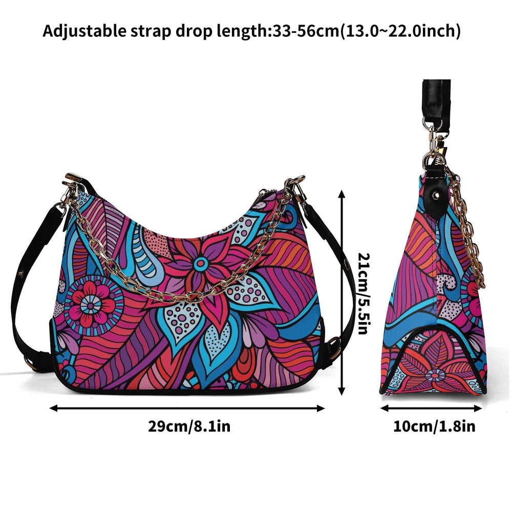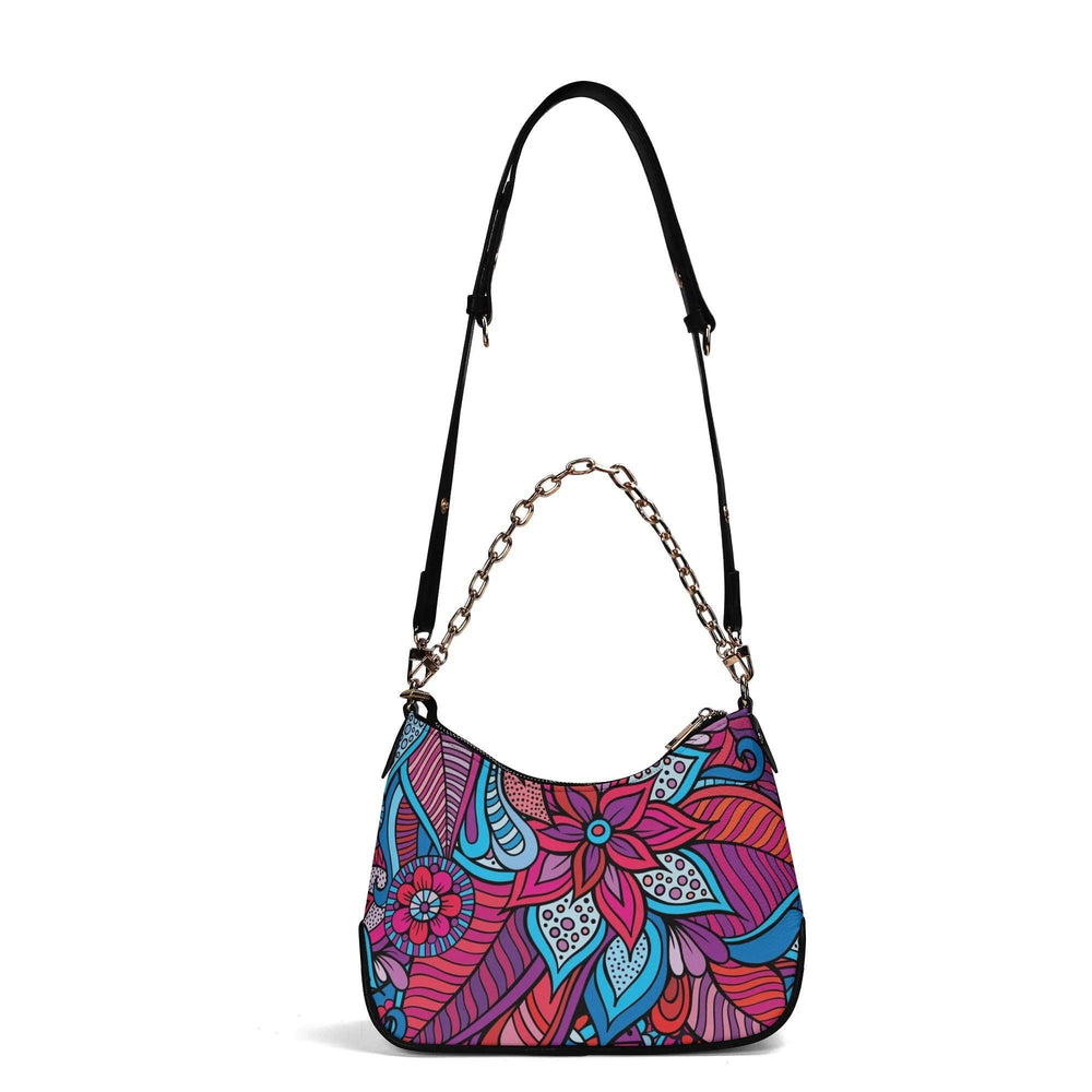 Unleash your vibrant personality with the Ultimate Bohemian Chic Shoulder Bag! This exquisite piece is more than just an accessory – it's a statement. Adorned in a symphony of bold floral patterns and vivacious colors, this bag is designed to turn heads wherever you go. The harmonious blend of pinks, blues, and purples against a sturdy background adds an artisanal touch to your ensemble. Featuring a luxurious gold chain and adjustable shoulder strap, this bag offers versatility and style in one package. Perfect for day outings, casual evenings, or a pop of color to any dull day, this bag seamlessly melds practicality with bohemian flair. Bring art into everyday life and carry your essentials with unparalleled panache!